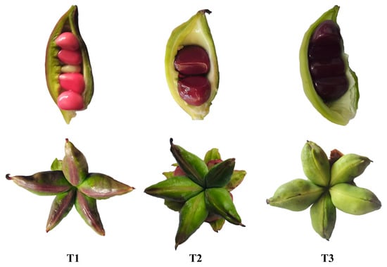 Meanwhile, three P. delavayi plants at different developmental stages were sampled from altitudes of 2400 m and 3400 m, respectively, labeled as M1, M3, and M5 and M2, M4, and M6. Each sampling occurred one month apart. Three independent P. delavayi plants were sampled for each developmental stage and altitude, with three biological replicates per plant (total n = 18) used for RNA-seq. Mixed samples from the same plant were subsequently used for Iso-seq. All seed samples were frozen in liquid nitrogen and stored at −80 °C until RNA extraction. The three developmental stages were identified based on key morphological characteristics: the yellow maturation stage (characterized by a pale yellow to pink variegated pericarp coloration with partial translucency), the physiological maturity stage (marked by a fully hardened, uniform brown seed coat), and the post-abscission stage (exhibiting complete blackening of the seed coat with pronounced desiccation features) (Figure 1).