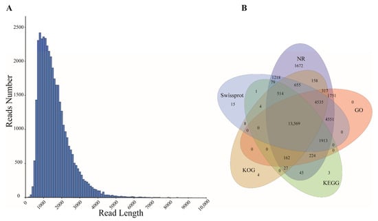 (A) Length distribution of PacBio Iso-Seq-assembled transcripts. (B) Venn plot of isoform numbers annotated to five databases (NR, Swiss-Prot, KOG, GO, KEGG).