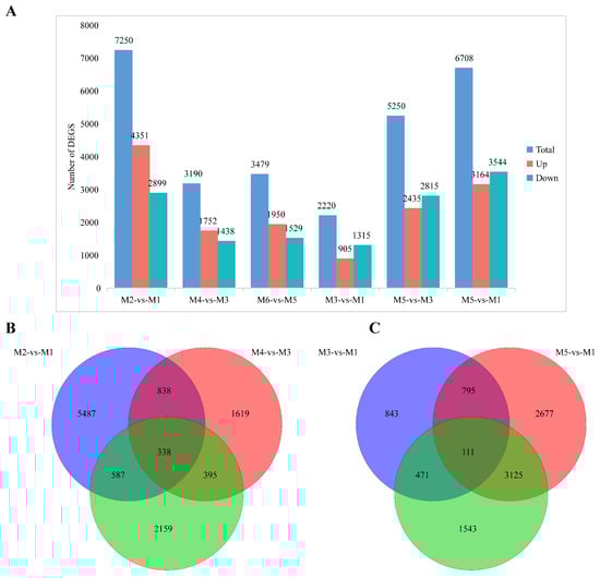 (A) Number of DEGs in pairwise comparisons across altitudes (M2 vs. M1, M4 vs. M3, M6 vs. M5). (B) Venn plot of DEGs at different altitude comparisons (M2 vs. M1, M4 vs. M3, and M6 vs. M5). (C) Venn plot of DEGs in different developmental stage comparisons (M3 vs. M1, M5 vs. M3, and M5 vs. M1).