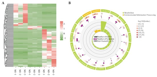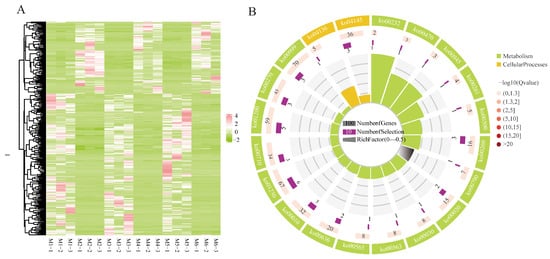 Differential expression analysis was performed using the DESeq2 package [29] with |log2 (Fold Change)| > 1 and an adjusted p value < 0.05. In additional, these identified differentially expressed genes (DEGs) were subsequently subjected to GO and KEGG enrichment analysis using Goatools [30] and KOBAS (http://bioinfo.org/kobas/%EF%BC%89, accessed on 3 July 2025), respectively. Benjamini–Hochberg adjusted p-values (q-value) below 0.05 were used to indicated significance. Conversely, the p-value was referenced when no significantly enriched terms or pathways were identified using the q-value.
