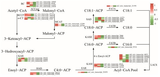To further uncover the key genes associated with the biosynthesis of fatty acids, the DEGs involved in fatty acid biosynthesis pathway were screened and clustered, yielding 34 genes, including eight DEGs encoding ACCase subunits: four biotin carboxylase (BC), two carboxyl transferase subunit alpha (α-CT), and two biotin carboxyl carrier protein (BCCP); two DEGs encoding malonyl-CoA: ACP transacylase (MACT); three DEGs encoding 3-oxoacyl-ACP synthase I (KASI); three DEGs encoding 3-oxoacyl-ACP synthase II (KASII); three DEGs encoding 3-oxoacyl-ACP reductase (KRA); two DEGs encoding 3-hydroxyacyl-ACP dehydratase (HAD); one DEG encoding enoyl-ACP reductases (EAR); six DEGs encoding long-chain acyl-CoA synthetase (LACS); four DEGs encoding stearoyl-ACP desaturase (SAD); and two DEGs encoding other components of FA synthase (Table S10). These encoded key enzymes in fatty acid biosynthesis are shown in Figure 6. Most of these genes were highly expressed in the early and middle stages of seed development and decreased in the later stages of seed development. And two genes encoding SAD (m3_mix_transcript_11271 and m3_mix_transcript_6098) exhibited a pattern of initial increase followed by a subsequent decrease as seed development progressed, displaying a bell-shaped curve with seed development over time.