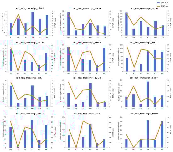 To verify the reliability of the RNA-Seq data, 12 DEGs were subjected to qRT-PCR analysis. The gene expression trends detected by RNA-Seq and qRT-PCR were consistent, providing support for the credibility and accuracy of the RNA-Seq results (Figure 7).