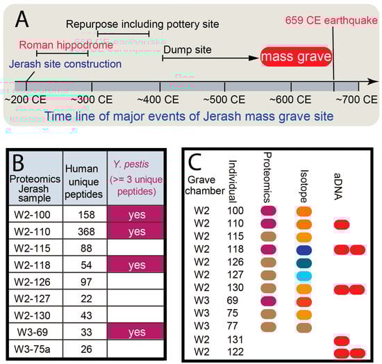 This study set out to investigate the presence of Y. pestis in human remains from a mass grave at the ancient archaeological site of Jerash, Jordan. Through combined proteomic screening and high-confidence ancient DNA sequencing, we successfully identified Y. pestis genomes from multiple individuals. These represent the first pathogen genomes recovered from this region and period, thereby bridging a major geographic and temporal gap in our understanding of the First Pandemic’s genetic footprint [2,23,24].