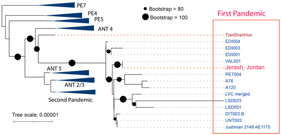 Phylogenetic confirmation of First Pandemic plague strains. The maximum likelihood phylogenetic reconstruction of Y. pestis strains from the First Pandemic. Tree topology bootstrapping was performed with 1000 replicates to assess the robustness of the inferred relationships. The Jerash strain groups with other First Pandemic strains and their branch lengths are represented. Dots along the branches indicate bootstrap support values greater than 80%, providing strong confidence in those relationships. Collapsed branches are shown with triangles. The Jerash strain is highlighted in red, while the Tian Shan Hun strain is shown in dark red, emphasizing their positions within the phylogeny relative to other strains from the same period.