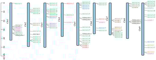 Chromosome localization map of SiLEA genes in foxtail millet. Genes from different subfamilies were assigned different colors for visual distinction.