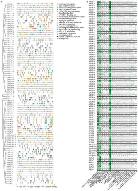 Cis-acting elements in promoter regions of SiLEA family genes in foxtail millet. (A) Distribution of cis-elements in promoter regions. Differently colored blocks represent distinct types of cis-elements and their positions within the 2000-bp upstream region of SiLEA genes. (B) Cis-element composition in promoters of individual SiLEA genes. Colors in the grid correspond to distinct cis-element types, and numbers indicate their counts, with vertical color bars corresponding to specific element types.