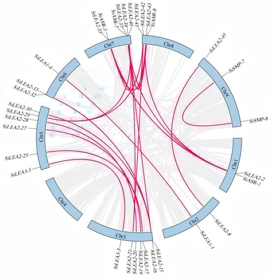 To investigate the evolutionary mechanisms of the SiLEA gene family in foxtail millet, intra-species synteny analysis was performed (Figure 5). A total of 24 segmental duplicate gene pairs encompassing 33 SiLEA genes (35% of all family members) were identified (Table S4). Duplication patterns varied across subfamilies: the SiLEA_2 subfamily displayed a complex duplication network, featuring multi-gene duplication units (e.g., SiLEA2-2 forming triplicate relationships with SiLEA2-35, SiLEA2-37, and SiLEA2-43) and bidirectional duplication pairs (e.g., SiLEA2-15 with SiLEA2-37 and SiLEA2-33; SiLEA2-16 with SiLEA2-30 and SiLEA2-32; SiLEA2-21 with SiLEA2-39 and SiLEA2-42; SiLEA2-29 with SiLEA2-40 and SiLEA2-41). SiLEA2-37 served as a quadruplicate node, interacting with SiLEA2-2, SiLEA2-15, SiLEA2-35, and SiLEA2-43. Five large segmental duplication pairs were specific to the SiLEA_2 subfamily: SiLEA2-8/SiLEA2-45, SiLEA2-19/SiLEA2-27, SiLEA2-20/SiLEA2-28, SiLEA2-17/SiLEA2-25, and SiLEA2-39/SiLEA2-42. The SiLEA_1, SiLEA_3, SiASR, and SiSMP subfamilies contained segmental duplicates, including SiLEA1-1/SiLEA1-4, SiLEA3-3/SiLEA3-5, SiASR-1/SiASR-5, SiASR-7/SiASR-8, and SiSMP-7/SiSMP-8. Conversely, no duplication events occurred in the SiLEA_4, SiLEA_5, SiLEA_6, or SiDehydrin subfamilies. All duplicated gene pairs belonged to the same subfamilies, implying that chromosomal segment duplications likely drove their expansion, potentially resulting in functional redundancy.
