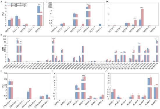 Expression patterns of SiLEA_1 (A), SiLEA_2 (B), SiLEA_3 (C), SiLEA_4—SiLEA_6 (D), SiDehydrin (E), SiSMP (F), and SiASR (G) subfamily genes in the panicles of foxtail millet. Young panicles of Jingu 21 were collected at two developmental stages: the branch meristem differentiation stage (young panicle stage 1, approximately 1.0–1.5 mm) and the distinct formation stage (young panicle stage 2, approximately 2.5–3.0 mm). Statistical significance was determined by t-test (*: p < 0.05, **: p < 0.01, ***: p < 0.001, ****: p < 0.0001). TPM: Transcripts Per Million.