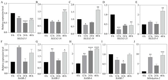 All ten SiLEA genes were detected in roots under ABA treatment (Figure 10). SiLEA2-5 expression declined under ABA treatment, reaching minimal levels by 24 h (Figure 10A). SiLEA2-16 and SiLEA2-19 expression decreased at 12 h but rebound to a 1.5-fold higher level by 48 h (Figure 10B,C). SiLEA2-21 expression also decreased at 12 h but partially recovered thereafter (Figure 10D). SiLEA3-4 activation occurred late, with expression peaking at 2.4-fold by 48 h (Figure 10E). SiASR-2 expression was induced by ABA treatment at 12 h (Figure 10F). SiASR-5 expression rose sharply at 12 h, returned to baseline at 24 h, and increased again by 48 h (Figure 10G). SiASR-6 expression increased steadily, reaching its highest level at 48 h (Figure 10H). In contrast, SiASR-7 expression decreased by 24 h (Figure 10I). SiDehydrin-2 showed an expression pattern similar to SiASR-5 (Figure 10J).