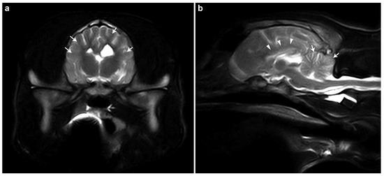 - Gonçalves, R.; Volk, H.; Smith, P.M.; Penderis, J.; Garosi, L.; MacKillop, E.; de Stefani, A.; Cherubini, G.; McConnell, J.F. Corpus callosal abnormalities in dogs. J. Vet. Intern. Med. 2014, 28, 1275–1279. [Google Scholar] [CrossRef]