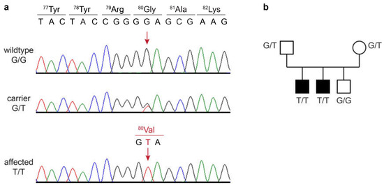 Details of the RAB24:c.239G>T variant. (a) Sanger electropherograms of a wildtype dog, a heterozygous carrier, and an affected dog. The position of the variant is shown with red arrows. The reading frame and amino acid translations of the wildtype and mutant sequence are indicated. (b) Genotype–phenotype co-segregation in the family. Affected dogs are represented with filled symbols. Genotypes at the RAB24:c.239G>T variant are indicated.