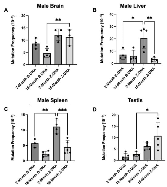 The results revealed an induction of mutations in the Z-DNA mice over the B-DNA mice at 2 months of age, with significance being observed in the liver and the spleen (Figure 1). Specifically, a ~2.9-fold increase (p = 0.0137) in mutations was observed in the liver (Figure 1B) and a ~1.9-fold increase (p = 0.0056) in mutations was observed in the spleen over that of the control B-DNA mice (Figure 1C). This induction in mutations was lost once the mice reached 18 months of age, and instead, Z-DNA-induced mutation frequencies were reduced by ~6.2-fold (p = 0.0022) in the liver and ~2.5-fold in the spleen (p = 0.0003) compared to the mice at 2 months of age (Figure 1B,C). No significant changes in Z-DNA-induced mutation frequencies were observed in the male brain or testis with increasing age (Figure 1A,D).