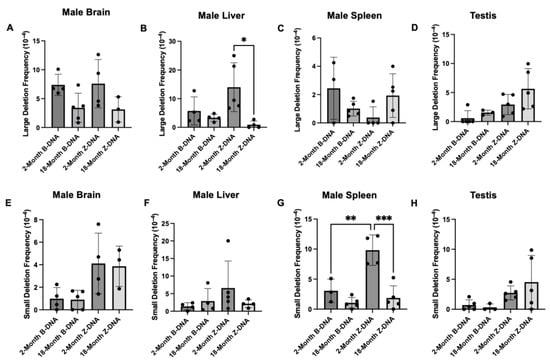 Brain, liver, spleen, and testis tissues from male mice were evaluated to determine the impact of aging on Z-DNA-induced mutagenesis. The results were unexpected in that Z-DNA-induced mutations either decreased or remained unchanged with increasing age (Figure 1). This variation in Z-DNA-induced mutations may be caused by the capacity for double-strand break repair in the tissues, as one study performed in rats observed variable nonhomologous end-joining (NHEJ) efficiencies in somatic tissues [35]. Few tissue-specific differences were observed in the Z-DNA-induced mutation spectra. The most common mutation that occurred were deletions, where small deletions were categorized at <30 bps and large deletions at >30 bps. Notably, a significant shift in the frequency of large deletions was observed in the male mouse liver tissue with age (Figure 2B). In contrast, a significant decrease in small deletions was observed in male mouse spleen tissue (Figure 2G). This may hint at tissue-specific DSB repair processes that are involved in the processing of Z-DNA. For example, Z-DNA-induced DSBs may be repaired by MMEJ in the liver, where large deletions were the predominant mutation type, and via NHEJ in the spleen, where small deletions were largely observed [36].