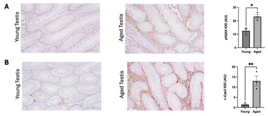Immunohistochemistry analysis of γH2AX and c-Cas3 in young and aged mouse testis tissues. (A) Representative image of γH2AX foci formation in young and aged testis tissues (n = 3). The results are quantified in the graph on the right. (B) Representative image of c-Cas3 in young and aged testis tissues (n = 3). The results are quantified in the graph on the right. A p-value < 0.05 was considered significant. * indicates a p-value < 0.05 and ** indicates a p-value < 0.01.