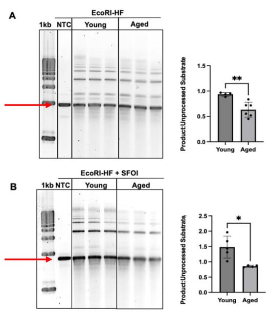 DNA end-joining analysis in young and aged mouse testis tissue. (A) End-joined DNA products formed in young and aged mouse testis extracts using DNA substrates with compatible overhanging ends created by EcoRI-HF. (B) End-joined DNA products in young and aged mouse testis extracts using DNA substrates with both an overhanging end and a blunt end. Unprocessed DNA substrates are represented by the red arrows. All DNA bands above the red arrows were considered end-joined products. A total of 4–6 mice were used for each group, and p < 0.05 was considered significant. * indicates a p-value < 0.05 and ** indicates a p-value < 0.01.