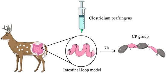 Anaesthesia was performed with xylazine hydrochloride injection (Huamu Animal Health Products Co., Ltd., Jilin, China), and subsequently, a dissection was performed via the linea mediana ventralis and the small intestine was exposed. The intestinal loops were about 3 cm in length and were securely ligated with medical sutures (Jinhuan, Shanghai, China). And a 5 cm gap was left between each of the two intestinal loops to avoid interfering with the blood supply. The intestine was rinsed with saline prior to injection, and 1 mL of FTG or C. perfringens type A (logarithmic growth period, approximately 1.5 × 108 CFU/mL) culture was prepared as specified in Section 2.1 and injected in equal amounts into each intestinal loop (Figure 1). The three intestinal loops injected with FTG were named as controls. The three intestinal loops injected with C. perfringens type A were labelled as the CP group. When injecting the loops, care was taken to avoid over-distension of the loops. Then, the abdominal wall incisions were sutured to the muscle and skin separately to prevent the loss of body temperature, and the animal was deeply anaesthetized throughout the experiment. Seven hours after inoculation, anaesthesia was administered to the animals using xylazine hydrochloride injection, the abdominal cavity was reopened and the small intestine was removed in the order of inoculation. Finally, the deer was euthanized.