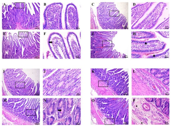 Histopathology of the intestinal tract after inoculation with C. perfringens. Haematoxylin–eosin staining showed intestinal structures. (A–D,I–L) Representative tissue sections of intestinal segments not inoculated with C. perfringens. The intestine was well organized and structurally hierarchical in the control group. (E–H) Representative histological sections of intestine injected with C. perfringens strain to the mucosal layer showing villi haemorrhage and necrosis. (M–P) Representative histological sections of the mucosal and submucosal layers of the intestine injected with C. perfringens strains, showing inflammatory cell infiltration in the intestine. The arrow represents necrosis, the triangle represents haemorrhage and the star represents inflammatory cell infiltration in figures. Size bars/magnifications: (A,C,E,G,I,K,M,O) = 100 μm/×100; (B,D,F,H,J,L,N,P) = 25 μm/×400.