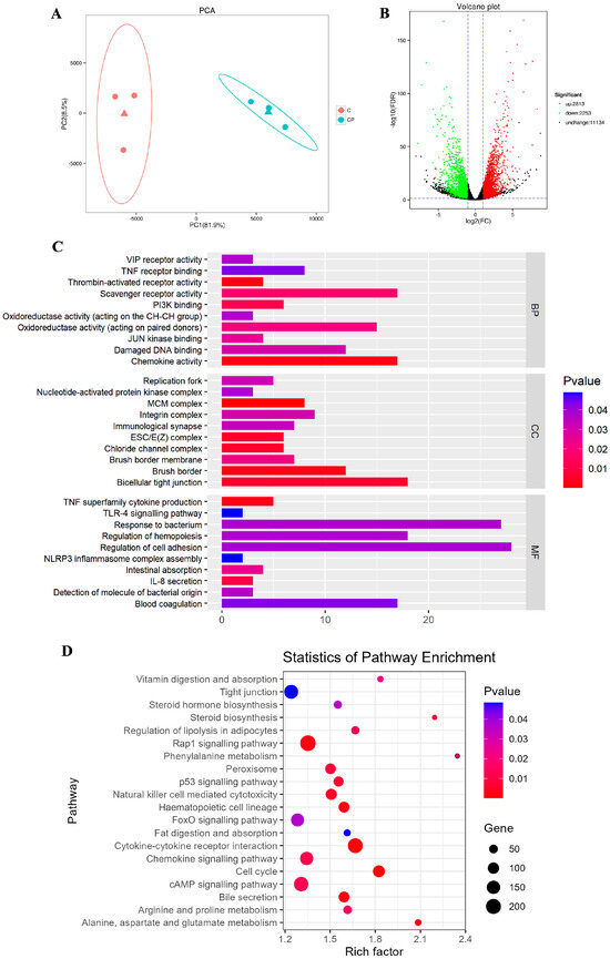 To investigate the molecular mechanisms of C. perfringens type A enteritis, we performed large-scale RNA sequencing of intestinal tissues from control and CP group. First of all, in the principal component analysis (PCA) scatter plot, we found that similar samples grouped, suggesting that the intra-group repeatability was relatively good, while there is a clear differentiation between the two groups (Figure 3A). By comparing the intestinal transcripts of the two groups, 5066 differentially expressed genes (DEGs) were identified, of which 2813 were upregulating DEGs and 2253 were downregulating DEGs (fold change > 2, q < 0.05) (Figure 3B).