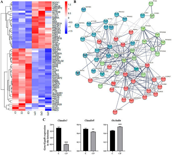 Genes significantly altered in the tight junction pathway in C. perfringens-infected intestines. (A) Heatmap showing tight junction genes with different expression. (B) Gene interaction network of genes that will vary in the tight junction pathway produced through the STRING website in the http://string-db.org. And, the genes were clustered, where the red circle proteins were mainly located in the intestine. (C) Changes in Claudin3, Claudin8 and Occludin mRNA levels in the intestine of deer. All results are expressed as mean ± SEM. The level of statistical significance of all data was determined by independent samples t-test. * indicates significant differences compared to the control group, specifically ** p < 0.01 and *** p < 0.001.