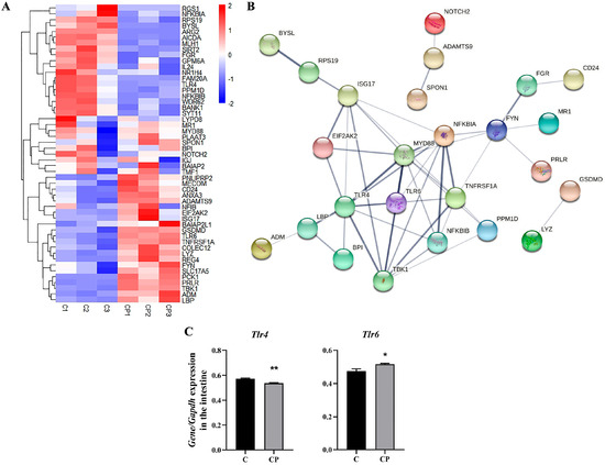 Genes altered in the pathway of response to bacterium in the C. perfringens-infected gut. (A) Heatmap showing differential expression of genes in response to bacterium. (B) A partial protein map of the gene interaction network of response to bacterium pathway generated through the STRING website, after removing proteins with lesser degrees of interaction, is available at http://string-db.org. (C) Changes in Tlr4 and Tlr6 mRNA levels in the intestine with C. perfringens infection. All results are expressed as mean ± SEM. The level of statistical significance of all data was determined by independent samples t-test. * indicates significant differences compared to the control group, specifically * p < 0.05 and ** p < 0.01.
