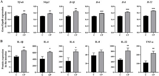 Pathogens trigger an inflammatory process that damages the tight junctions, thereby disrupting the intestinal barrier [23]. Based on the results of the histological and transcriptomic analyses, it was known that C. perfringens type A inoculation triggered an inflammatory and immune response in the deer intestine after enteritis. To investigate, we performed mRNA and protein-level assays of immunoinflammation-related pathways by the Enzyme-linked Immunosorbent Assay (ELISA). The study showed that the TLR signalling pathway leads to activation of NF-κB, which in turn leads to upregulation of pro-inflammatory factors, such as IL-1β, 6 and TNF-α [24]. Therefore, we found that both genes and proteins of the interleukin family (IL-1β, IL-4, IL-6 and IL-22) were significantly upregulated in the CP group and that protein levels of IL-8 tended to increase in the CP group (Figure 6). In addition, the mRNA levels of both Nf-κb and Nlrp3 inflammasome were significantly elevated, demonstrating that C. perfringens type A triggers intestinal inflammation. The results suggest that C. perfringens type A damages the intestine and induces enteritis mainly by promoting immunoinflammation-related proteins.