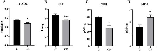 Studies have shown that C. perfringens type A mediated an increase in reactive oxygen species (ROS) content and a decrease in cellular antioxidant capacity in intestinal epithelial cells [25]. This is supported by our transcriptome results for significant enrichment of oxidoreductase activity and scavenger receptor activity in the GO analysis and peroxisome pathway in the KEGG analysis. To assess the level of intestinal antioxidant capacity and to validate the results of transcriptome analysis, total antioxidant capacity (T-AOC), catalase (CAT), malondialdehyde (MDA) and glutathione (GSH) were measured in the intestine before and after C. perfringens type A infection using antioxidant kits. The T-AOC is widely used to assess the total antioxidant capacity of all antioxidants in a sample and reflects, to some extent, the total ability of the body to scavenge reactive oxygen species/nitric oxide synthase (ROS/NOS). Also, CAT and GSH both have antioxidant activity of substances, and conversely, MDA reflects the level of lipid oxidation. We found that T-AOC, CAT and GSH levels were significantly lower (Figure 7A–C) and MDA levels were significantly higher (Figure 7D) in the intestine inoculated with C. perfringens type A compared to the control intestine. The results indicated that the deer intestinal antioxidant enzyme activity was reduced and lipid oxidation was increased, and the total antioxidant capacity of the intestine was significantly decreased after inoculation with C. perfringens.