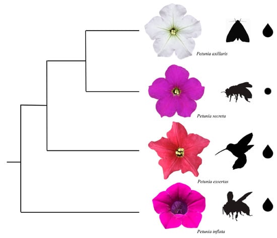 The observed similarities among species with long corolla tubes and different pollinators may stem from their common ancestry. The white P. axillaris is at the base of this group, with P. exserta and P. secreta as the more recently evolved species [15]. Divergence among these species has been associated with local adaptation, which enables them to attract new pollinators or colonize new environments [48,49,50].