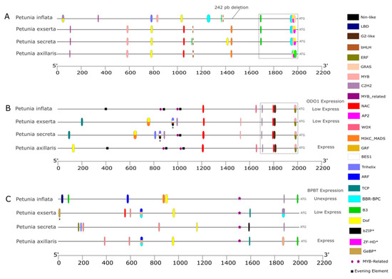 The biosynthesis and release of floral volatiles depend on the coordinated regulation of various enzymes and compounds. The genes EOBII and ODO1 are involved early in this process [31,43]. In Petunia species, BPBT plays a crucial role in producing and releasing aromas [17]. The scentless P. inflata differs from the fragrant P. axillaris in the composition of the EOBII motifs. However, the gene structure remains conserved in species with long corolla tubes, even though P. secreta and P. exserta are described as scentless [13]. Some transcription factors predicted to bind the EOBII promoter have similar roles, which suggests that this gene may be involved in pathways beyond volatile compound biosynthesis [35]. The ODO1 structure and protein motif composition follow the EOBII pattern; however, the regulatory elements exhibit significant divergence. The promoter region of scented P. axillaris is more similar to that of the unscented P. inflata than to other long corolla tube species, with only one additional DOF site (Figure 3B). We found that P. exserta has lost all predicted TF binding sites for EOBII and LHY, which regulate the activation of ODO1 in the evening and its circadian repression in the morning, respectively. This likely contributes to the low expression of ODO1 and reduced scent emission in P. exserta [17]. Since ODO1 is a key TF that activates multiple genes in the FVBP pathway, its decreased expression may limit the biosynthesis of floral volatile compounds, explaining the scentless phenotype of P. exserta flowers. Similarly, our analysis showed that P. secreta has partially lost the binding sites for EOBII and LHY. Although ODO1 expression in P. secreta has not yet been characterized, we hypothesize it may also be downregulated, leading to reduced floral volatile emission. While P. secreta is described as scentless, volatile compounds have been identified in its pollen [20], which is used as a floral reward to attract its specific pollinator.