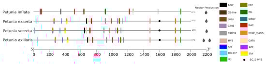The genus Petunia is a relatively young group of plants with species divided into two main groups. Each group is supported by the length of the corolla tube [9]. P. axillaris, P. exserta, and P. secreta have long corolla tubes, while P. inflata belongs to the short corolla tube group. The evolutionary relationships among gene sequences involved in pollinator-attractive traits closely reflect the species’ phylogeny, consistent with other studies based on Solanaceae genes and processes [40,45,46,47]. Likewise, regulatory elements and gene structures mostly follow the species’ evolutionary history. However, different pollination syndromes are present, and there is an unexpected lack of convergence between the two bee-pollinated species.