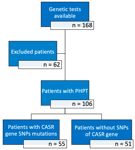 In this retrospective, monocentric study, we considered 168 Italian patients, admitted to our Endocrinology Unit of the Padua Hospital between 2020 and 2024, on whom genetic analysis for CASR, MEN1 e CDC73 genes was performed during the process of diagnosis and therapeutical management of bone-related conditions. The following inclusion criteria were applied: (a) patients affected by PHPT; (b) patients who provided written informed consent to genetic testing; (c) patients presenting CASR gene polymorphisms (A986S, R990G, Q1011E). PHPT diagnosis was based on high levels of ionized calcium in the presence of high serum PTH levels, with adequate levels of 25-OH vitamin D and normal renal function. Pre-surgical identification of parathyroid lesions was performed through ultrasound examination of the neck and/or scintigraphy with technetium-sestamibi, and in some cases with 18Fluorocholine-PET/RM. In patients undergoing parathyroidectomy surgery, anatomopathological examination was also performed on the surgical sample. The following exclusion criteria were applied: (a) patients affected by other diseases such as FHH, hypoparathyroidism, MEN syndromes, CDC73-related disorders and their first-degree relatives; (b) patients with SNPs of MEN1 and CDC73 genes; (c) patients who presented polymorphisms of the CASR gene different from those under study; (d) patients with other comorbidities interfering with phospho-calcium metabolism or that were already taking interfering drugs (thiazide diuretics, bisphosphonate, cinacalcet); (e) patients with incomplete medical records. According to our inclusion and exclusion criteria, a total of 106 subjects were finally selected. They were subsequently split into two groups based on the presence/absence of A986S, R990G, Q1011E polymorphisms of the CASR gene in their genetic analysis, as resumed in Figure 1.