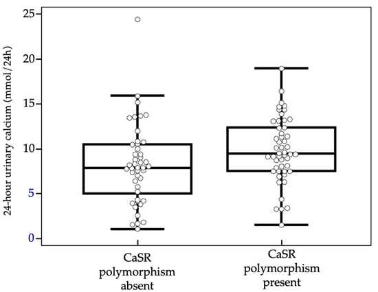 As already described and reported in Table 1, median values of calcium excreted in the urine over 24 h were higher in subjects carrying CASR polymorphism than in non-carriers, with statistically significant differences (see also Figure 2).