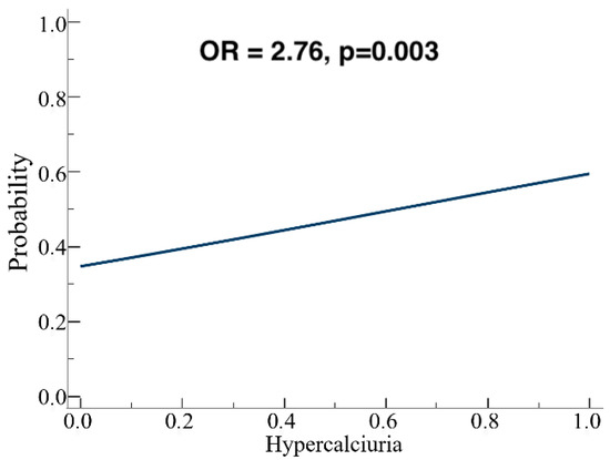One of the most promising results comes from a univariate logistic regression, as for every 0.25 mmol/24 h increase in 24-h urinary calcium, the likelihood of having the polymorphism detected in genetic analysis increased byOdds ratio = 1.29, p = 0.016. Indeed, considering the categorical variable “hypercalciuria”, defined as a lab value above the cut-off of 7.5 mmol/24 h, the model’s significance was further confirmed (Odds ratio = 2.76, p = 0.003).