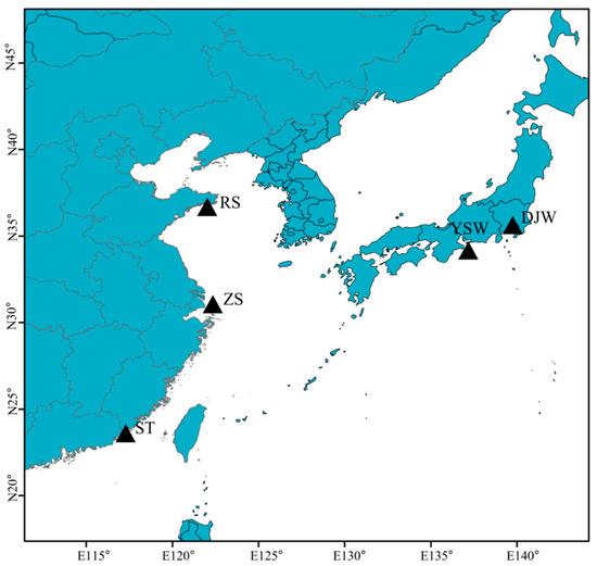 Fifty samples of S. japonica were collected from five distinct geographical populations located in ZS, ST, RS, YSW, and DJW (sampling locations shown in Figure 1). Dorsal muscle tissues were immediately immersed in liquid nitrogen and stored at −80 °C until further analysis. Total DNA was extracted from muscle tissues using the standard phenol–chloroform method [24]. DNA concentration and purity (OD260/OD280 ratio) were measured with a NanoDrop 2000C spectrophotometer (Thermo Fisher Scientific, Waltham, MA, USA), while integrity was verified by 1.0% agarose gel electrophoresis. Qualified DNA samples were dissolved in sterilized ddH2O for subsequent experiments.