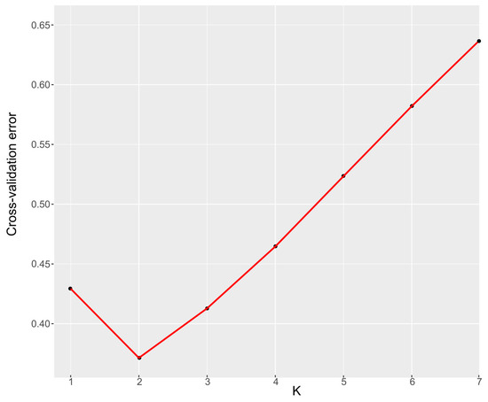 Cross-validation plot displaying CV-error versus K, suggests K = 2 is the best fit.