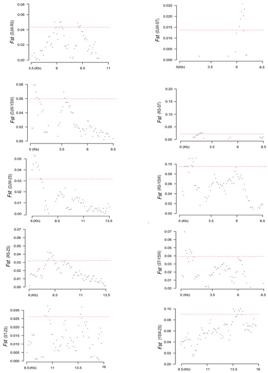 Population divergence (top 5% Fst) among DJW, YSW, ZS, RS, and ST. Each dot on the mitochondrial genome represents the Fst value at a specific position, reflecting the level of genetic differentiation in that region; the red line serves as the screening threshold, and the dots above the red line are exactly the 5% of highly differentiated loci under selection pressure in the mitochondrial genome.
