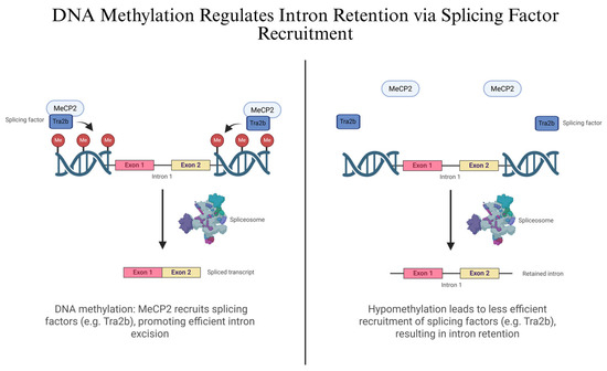 DNA Methylation Regulates Intron Retention via Splicing Factor Recruitment. This figure illustrates how DNA methylation influences IR by regulating the recruitment of splicing factors. (Left panel): DNA methylation allows MeCP2 to bind and recruit the splicing factor Tra2b, facilitating spliceosome assembly and efficient intron excision, resulting in a fully spliced mRNA transcript. (Right Panel): Hypomethylation leads to less efficient recruitment of splicing factors, resulting in IR. Created in BioRender. Ana L. Porras-Tobias. (2025) https://app.biorender.com/illustrations/687a5426628f4dc88167e093.