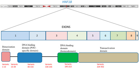 HNF1B is located on the long arm of chromosome 17 (17q12) and it consists of nine exons. The figure shows the main functional domains and the distribution of the variants. The variants are listed according to the schema proposed in Table 1 (for example, the variants from 1 to 13 of Table 1 are within the dimerization domain).