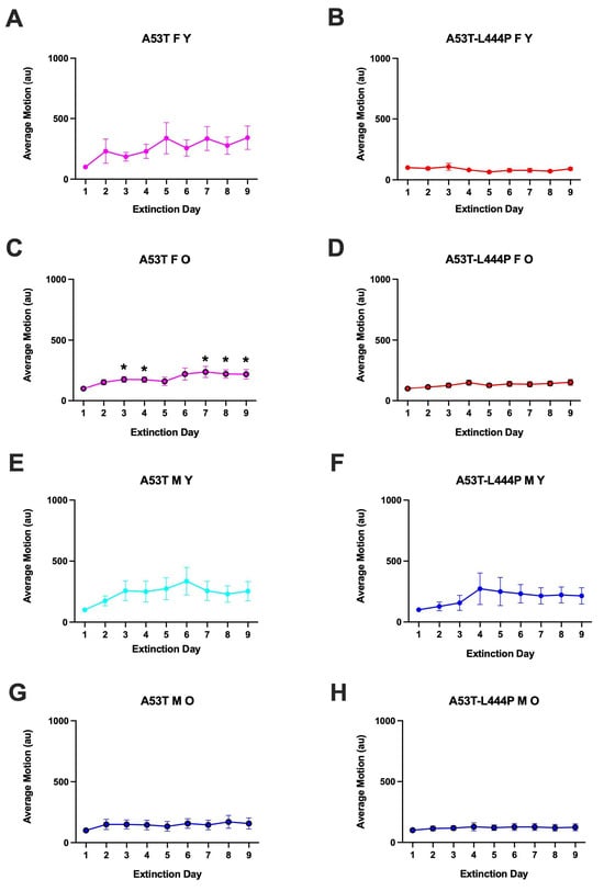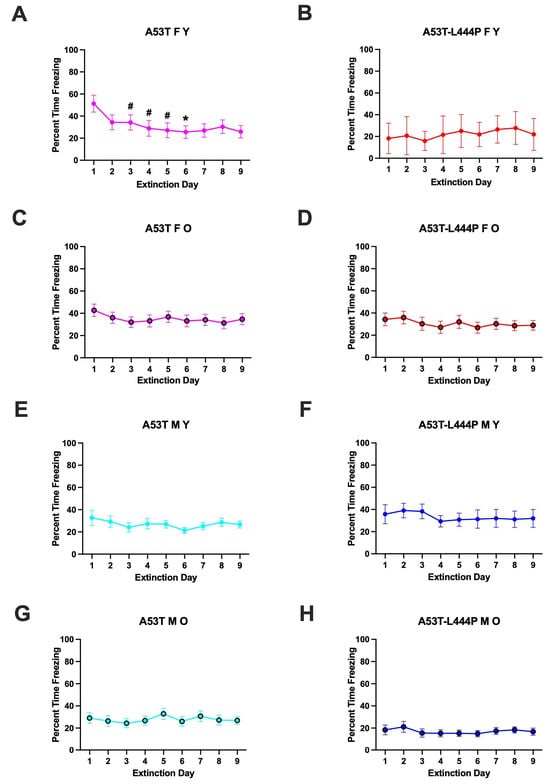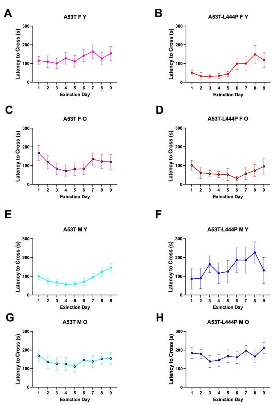 APA StyleBunnell, E., Saltonstall, E., Pederson, A., Baxter, C., Ramicciotti, E., Robinson, N., Sandholm, P., O′Niel, A., & Raber, J. (2025). Extinction of Contextual Fear Memory and Passive Avoidance Memory and Subsequent Anxiety-like and Depressive-like Behavior of A53T and A53T-L444P Mice. Genes, 16(9), 1004. https://doi.org/10.3390/genes16091004