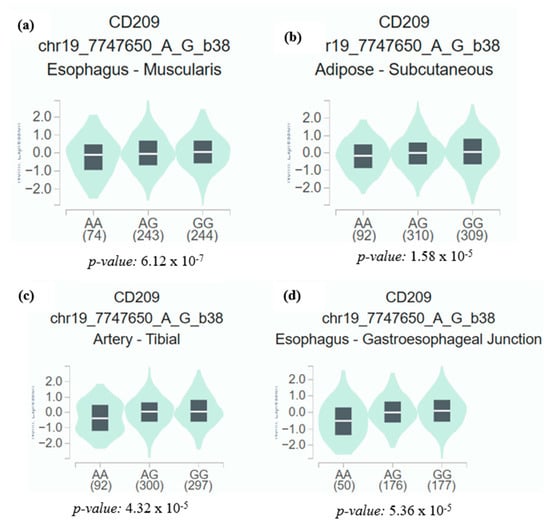 Figure 1. eQTL violin plot of rs2287886 variant. The genotype of rs2287886 was associated with gene expression of CD209 gene in different tissues in GTEx database. (a) Esophagus, (b) adipose, (c) artery, and (d) esophagus.
