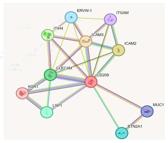 Figure 2. A protein–protein interaction network for the CD209 gene showing 11 nodes. The network was visualized using STRING, with edge color intensity indicating the confidence level of functional associations.
