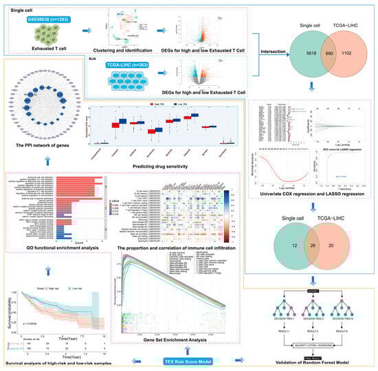 In this study, we integrated scRNA-seq and bulk RNA-seq data to characterize exhausted T cells (TEX) in HCC (Figure 1). Using the least absolute shrinkage and selection operator (LASSO) regression analysis for feature selection, we identified TEX-associated signatures to construct a prognostic scoring system and explored mechanisms underlying high-TEX and low-TEX groups, including immune infiltration, oncogenic pathways, and protein–protein interaction (PPI) networks.