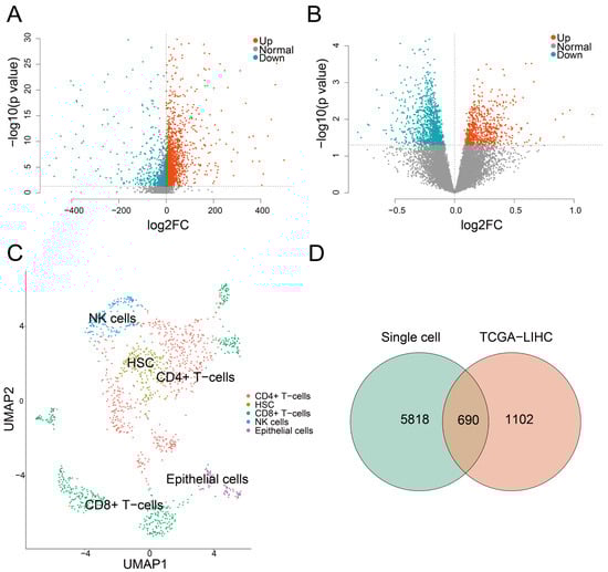 The result of differential expression analysis. (A) A volcano plot of differential expression analysis for GSE98638. (B) A volcano plot of differential expression analysis for TCGA. The red and blue color represent the significantly up-regulated and down-regulated genes. The x-axis represents the log2 fold change (log2FC), and the y-axis represents the −log10(p value) from the differential expression analysis. (C) The UMAP result of GSE98638 showing the annotation and color codes for 5 cell types in HCC. (D) A venn diagram of single-cell and bulk DEGs.