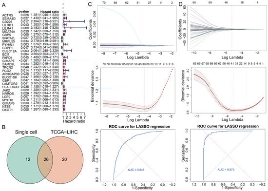 Identification of TEX-related prognostic genes. (A) The significant result of univariate Cox regression analysis on 690 genes. The red and green box represent positive and negative association with risk event, respectively. (B) The intersection of robust marker genes between Single cell and TCGA-LIHC. (C) Identification of biomarkers in single-cell data. (D) Identification of biomarkers in bulk data. The first panel represents the LASSO coefficient path for risk factors. The second panel represents the cross-validation curve. The third panel represents the AUC of LASSO regression analysis.