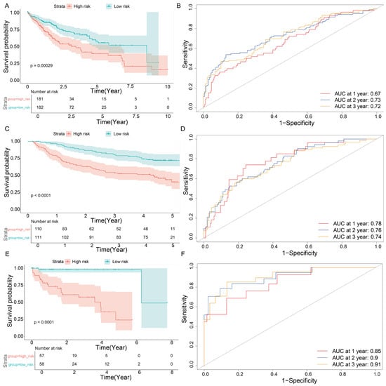 Survival analysis. (A) The survival result of TCGA. (B) The AUC of TCGA. (C) The survival result of GSE76427. (D) The AUC of GSE76427. (E) The survival result of GSE14520. (F) The AUC of GSE14520. The top figure of the survival result represents the survival curve, and the bottom figure of the survival result represents the number of survivors at different time points.
