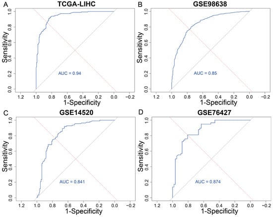 A diagnostic model based on the random forest algorithm was constructed using the randomForest (v4.7) package in R. We set the number of trees to 500, which ensured both stability and computational efficiency, and enabled feature importance estimation. Model hyperparameters were optimized through grid search combined with ten-fold cross-validation on the training datasets. GSE98638 and TCGA-LIHC were used as training datasets, and GSE14520 and GSE76427 were served as independent validation datasets. The model performance was evaluated using the area under the curve (AUC) calculated by the pROC (v1.18) package in R.
