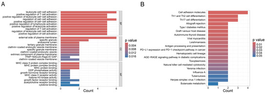 Functional enrichment result of TEX gene signature. (A) GO analysis. The top barplot represents the result of BP. The middle barplot represents the result of CC. The bottom barplot represents the result of MF. (B) The result of KEGG. The count of each barplot represents the number of genes enriched in function, and the color represents the p value.