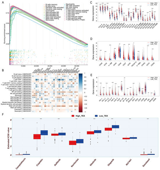 The immune result for TEX gene signature. (A) The GSEA result of immune infiltration. (B) Correlation coefficient between signature and immune infiltration. The color represents the Pearson correlation coefficient. (C) Antigen presentation expression between high-TEX and low-TEX group. (D) Costimulatory signal expression between the high-TEX and the low-TEX group. (E) Immune checkpoint molecule expression between the high-TEX and the low-TEX group. (F) Drug sensitivity between the high-TEX and the low-TEX group. “***”, “**” and “*” denote p-values of ≤0.001, 0.01, and 0.05 in (C–F).