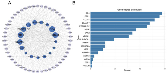 In order to further validate the functional roles of the exhaustion-associated gene signature, we constructed a PPI network using the 26 identified genes. The resulting subnetwork consisted of 67 nodes and 405 edges, with 17 of the 26 gene signature present (Figure 8A). Notably, five of these genes—CD4, PRF1, CD244, SLAMF7, and PDCD1LG2—had a degree ≥40, indicating central positions within the network (Figure 8B). CD4 expression is dynamically regulated during TEX, particularly in the HCC tumor microenvironment, where TEX cells compromise immune surveillance and therapeutic efficacy [39]. CD244, also known as 2B4, is a co-inhibitory receptor strongly associated with TEX. Its expression is upregulated in CD8+ T cells under immunosuppressive conditions, such as cytomegalovirus infection following liver transplantation [40]. SLAMF7 plays a key role in modulating T cell function and immune escape within the HCC microenvironment. SLAMF7 is not only involved in regulating CD8+ TEX but is also positively correlated with immunotherapy responsiveness in HCC patients. Its expression influences macrophage recruitment and polarization through inhibition of CCL2, thereby shaping the immune milieu [41]. PDCD1LG2 is a critical immune checkpoint involved in TEX in HCC. Elevated PDCD1LG2 expression is associated with favorable clinical outcomes, including improved recurrence-free, progression-free, disease-specific, and overall survival, underscoring its potential prognostic and immunomodulatory roles [42].