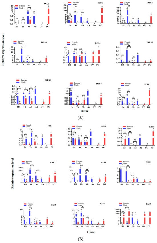 Tissue expression profile analysis of sex pheromone biosynthesis related genes in G. qinghaiensis. Male antennae (An); head (with antennae removed) (Hd); thorax (Th); abdomen (Ab); ovary (OV); sex pheromone glands (PG). RPS15 was used as the internal reference gene to correct the expression level of each tissue, and the expression level of the target gene in the PG was used as a positive control. Error bars indicate the standard error of 3 independent experiments, different uppercase and lowercase letters indicate significant differences between male and female tissues, and single and double asterisks indicate significant differences in the relative expression levels of target genes in the same tissue, and between males and females (t-test, * p < 0.05; ** p < 0.01; ns: not significant). (A) ACC1, DES1~8; (B) AR1~6, FAR1~3; (C) FAR4~7, FAS1~5; (D) ACT1~4.