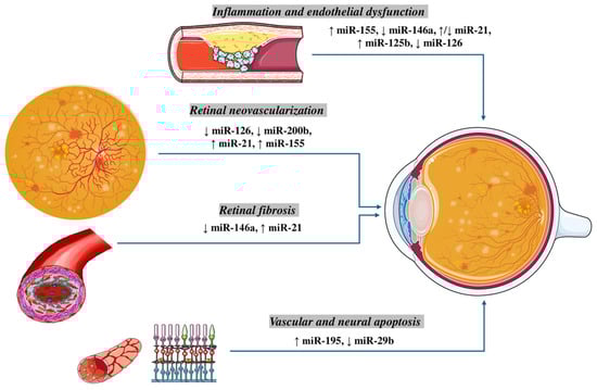 The regulation of MicroRNAs (miRs) in Pathogenesis of Diabetic Retinopathy. Inflammation and endothelial dysfunction: An upregulation of miR-155 and miR-125b, along with a downregulation of miR-146a and miR-126, have been implicated in promoting vascular inflammation, leukostasis, and impairment of endothelial cell function. Notably, miR-21 shows a context-dependent regulation, being reported as both upregulated and downregulated in different experimental settings. Retinal neovascularization: Aberrant angiogenesis in diabetic retinopathy is associated with reduced expression of the pro-angiogenic miR-126 and anti-angiogenic miR-200b, while miR-21 and miR-155 are consistently upregulated, favoring VEGF-driven neovascular responses. Retinal fibrosis: Fibrotic remodeling is driven by elevated miR-21 and decreased miR-146a, which together promote extracellular matrix deposition and activation of pro-fibrotic signaling pathways. Vascular and neural apoptosis: Increased expression of miR-195 and reduced levels of miR-29b contribute to endothelial and neuronal cell apoptosis, highlighting their role in the degenerative aspects of diabetic retinopathy.
